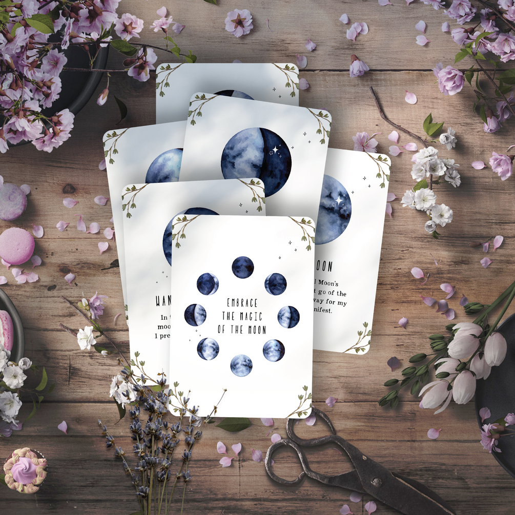 This set includes 8 beautifully designed cards, each featuring a different phase of the moon and its corresponding affirmation.