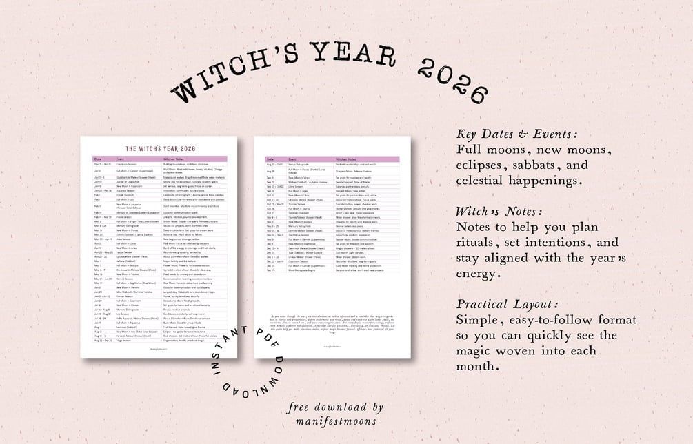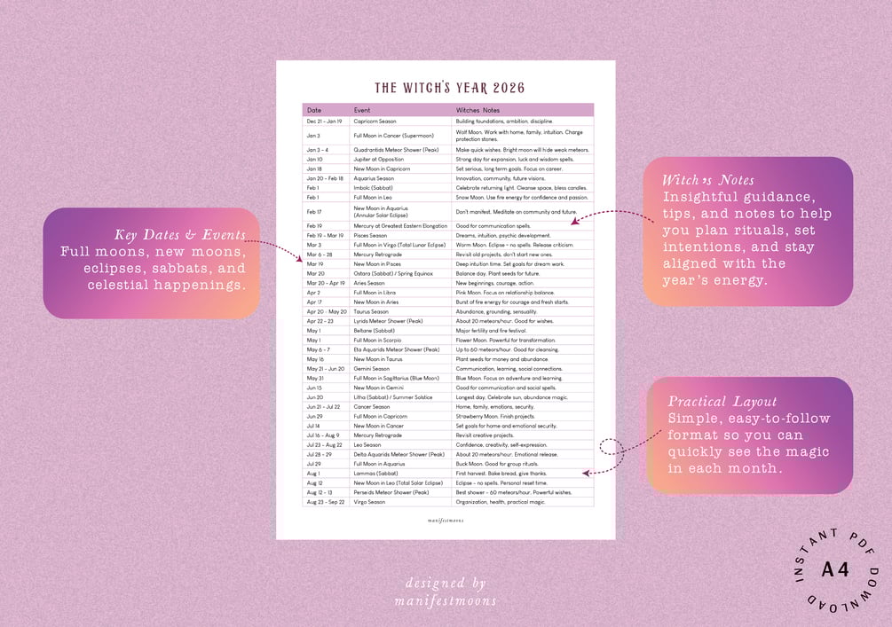 • Witch’s Notes: Insightful guidance, tips, and notes to help you plan rituals, set intentions, and stay aligned with the year’s energy.